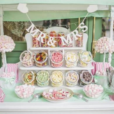 Während ein Sweet Table, ein komplettes Kuchen-oder Dessert-Buffet ersetzt, ist eine Candy Bar, eine liebevoll zusammengestellte Sammlung, von farblich und auf das Motto abgestimmter, Süssigkeiten.