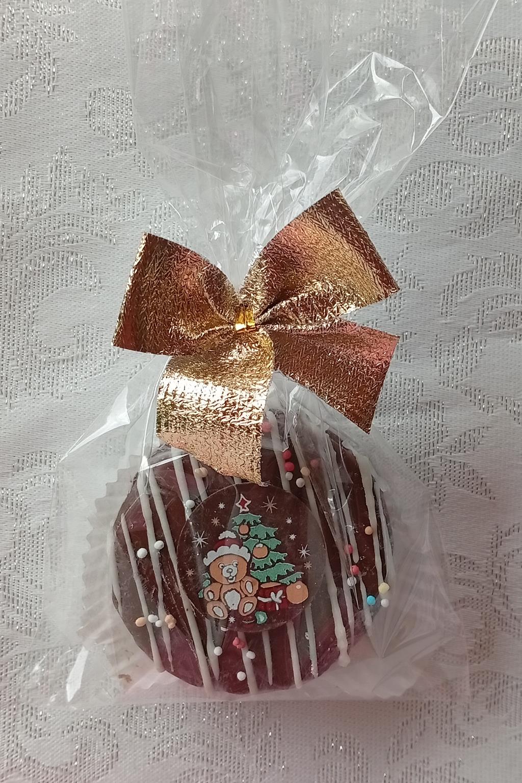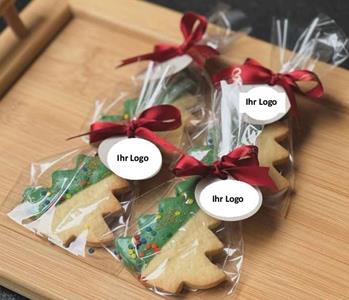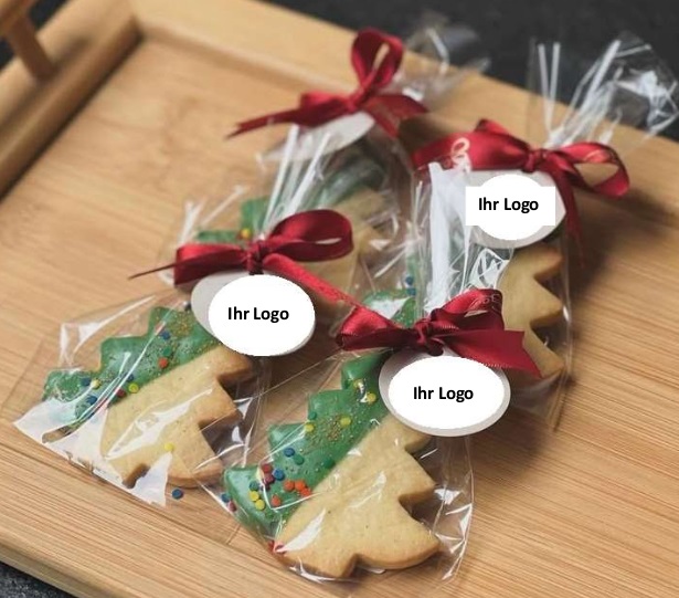 Verpackt in Cellophan mit Stoffband und „Merry Christmas“-Schild. Auf Wunsch, kann statt dem „Merry Christmas“-Schild, kostenlos Ihr Werbeschild an der Masche angebracht werden.